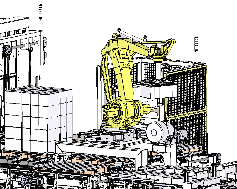 Finished goods can be transported by modularized conveyor system installed on the wall or ceiling and directed to palletizing stations where they are stacked neatly in order, stretch wrapped and moved to a warehouse for depalletizing.